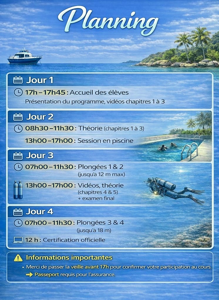 - Organisation : Une combinaison de cours théoriques, de pratiques en piscine et de plongées en milieu naturel.